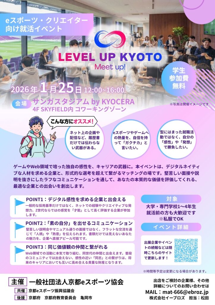 【重要】寒波に伴う開催判断と交通機関への影響について 1月25日(日)は強い寒波の予報が出ておりますが、本イベントは屋内開催のため、現時点では「開催予定」です。 ただし、開催地である京都府亀岡市は京都市内と比較して積雪・凍結の影響を受けやすい地域です。 また、利用路線の「JR嵯峨野線(山陰本線)」は天候により運休や遅延が発生する可能性があります。 無理な来場は控え、身の安全を最優先にしてください。 当日の朝、大幅な変更がある場合は本サイトにてお知らせします。 出発前に必ず運行状況をご確認ください。 JR西日本 運行状況を確認する ■ 『LEVEL UP KYOTO Meet up!』とは? 一般的な合同説明会とは全く違う、「クリエイティブな感性」を持つ学生と、そういった新しい才能を求めている企業をつなぐコミュニケーションイベントです。 堅苦しいスーツも、マニュアル通りの志望動機も必要ありません。 必要なのは、あなたの「好きなことへの熱量」だけ。 普段の自分(素の自分)で企業担当者と話し、相性の良い会社を見つけに来てください。 ■ このイベントに参加する3つのメリット 1. あなたの「デジタルな才能」が評価される eスポーツのランク、SNSのフォロワー数、動画制作の経験、イベント企画の実績…。 従来の就活では伝わりにくかったそのスキルを、「即戦力・ポテンシャル」として高く評価する企業に出会えます。 2. 面接なし!ラフな交流で自分をアピール 企業担当者とフランクに話せる座談会や、ゲーム対戦などを通じて交流します。 書類選考では伝わらない、あなたの「人柄」や「熱意」をダイレクトに伝えられるため、自分に合った企業が見つかりやすくなります。 3. 同じ熱量を持つ「仲間」とつながる 会場には、あなたと同じようにゲームや創作活動に本気で取り組む学生が集まります。 大学や学部の垣根を超えた「同志」との出会いは、就活だけでなく、これからの人生の財産になるはずです。 ■ 開催概要 イベント名: eスポーツやクリエイターに特化した就活マッチングイベント「LEVEL UP KYOTO Meet up!」 日時: 2026年1月25日(日曜日)OPEN:12:00 / CLOSE:17:00 会場: サンガスタジアム by KYOCERA 4F SKYFIELD内 コワーキングゾーン 参